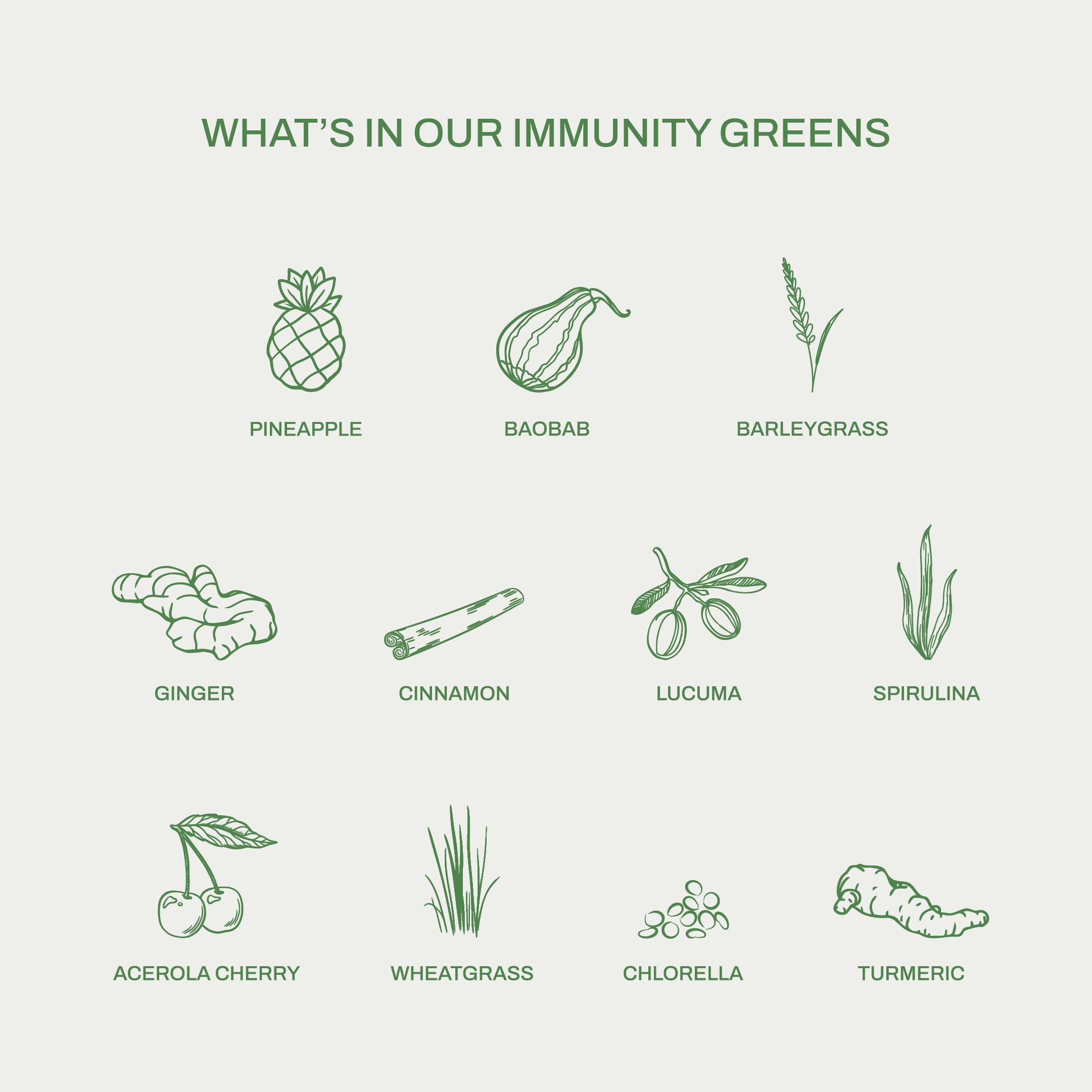 Organic Pineapple powder, Organic Date powder, Organic Barleygrass powder, Organic Lucuma powder, Organic Baobab powder, Organic Spirulina powder, Organic Acerola cherry powder, Organic Wheatgrass powder, Organic Ginger powder, Organic Chlorella powder, Organic Ceylon Cinnamon powder, Organic Turmeric powder.